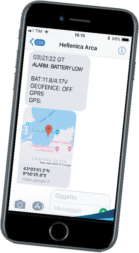 ASN comunica in tempo reale eventuali allarmi (con in abbinamento di posizione satellitare dell’imbarcazione) direttamente sul vostro cellulare, a mezzo invio SMS